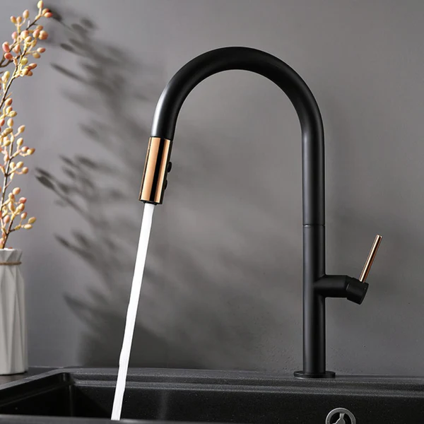 Elegant matte black and gold pull-down kitchen faucet with dual spray modes, SUS304 stainless steel build, and smooth retract design for modern functionality.