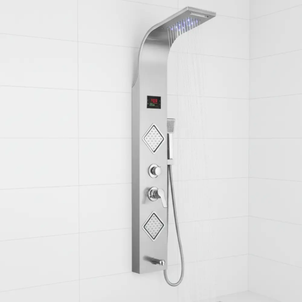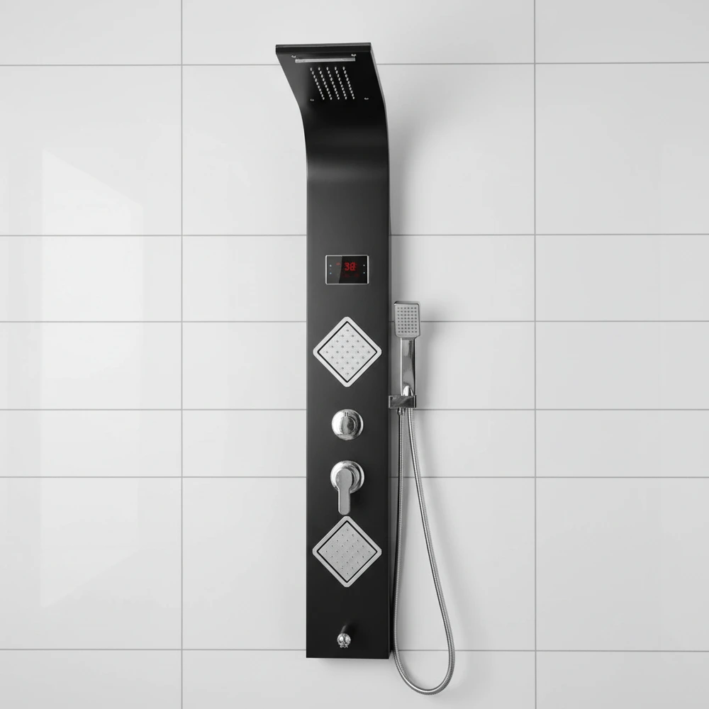 This panel offers five shower functions — a soothing rainfall shower, relaxing waterfall mode, powerful ellipse ray body jets, and a 48-nozzle hand shower for complete versatility. The LED lights and digital temperature display are powered by water flow, adding convenience without the need for external power.